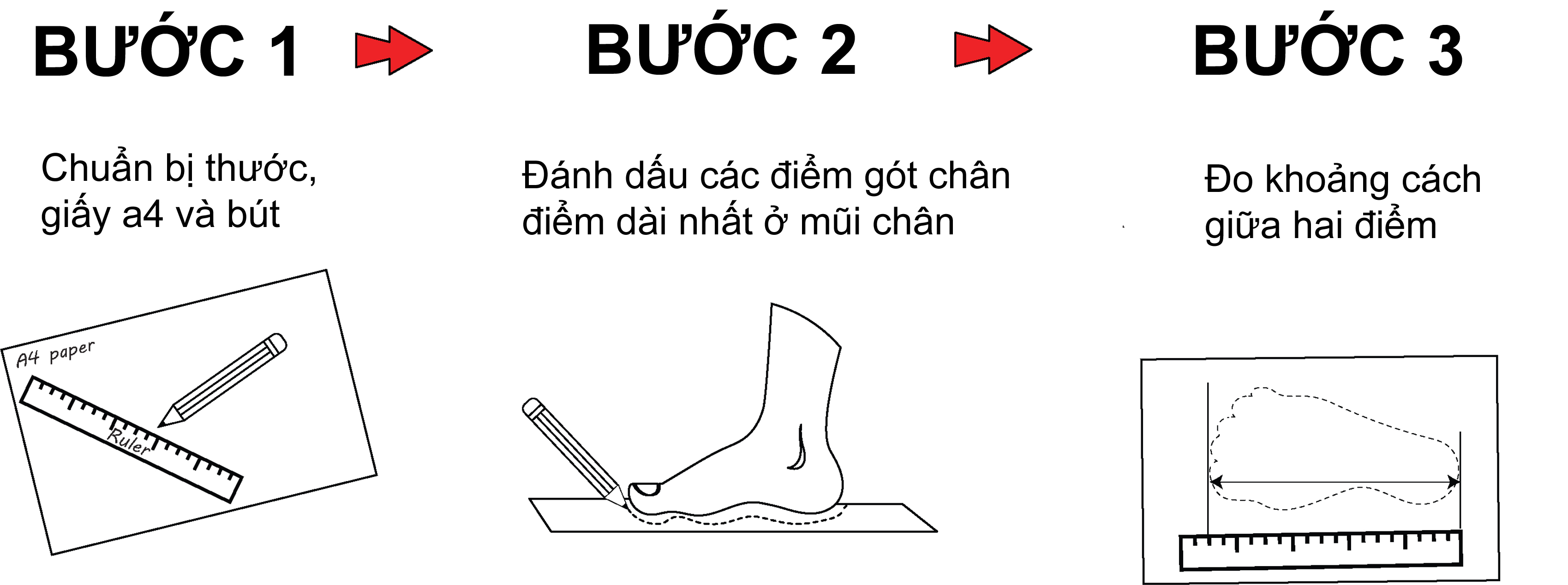 – Kẻ hai đường song song ở mũi và gót sau đó đo khoảng cách giữa chúng. Chiều dài từ mũi đến gót chính là chiều dài bàn chân.